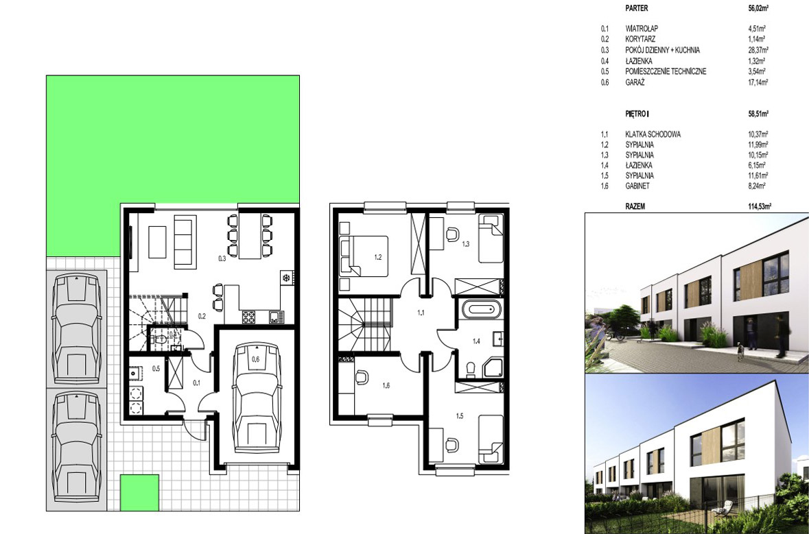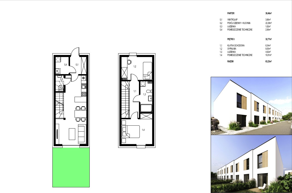 To niewielkie osiedle składa się z 16 domów w zabudowie szeregowej o powierzchniach: